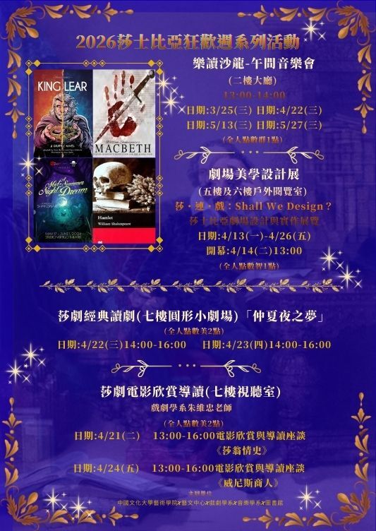 為推廣戲劇藝術與經典文學之美,藝術學院、藝文中心與圖書館特別舉辦2026「莎士比亞狂歡週」系列活動,邀請師生走進文藝復興的藝術世界,感受經典跨越時代的文化魅力。